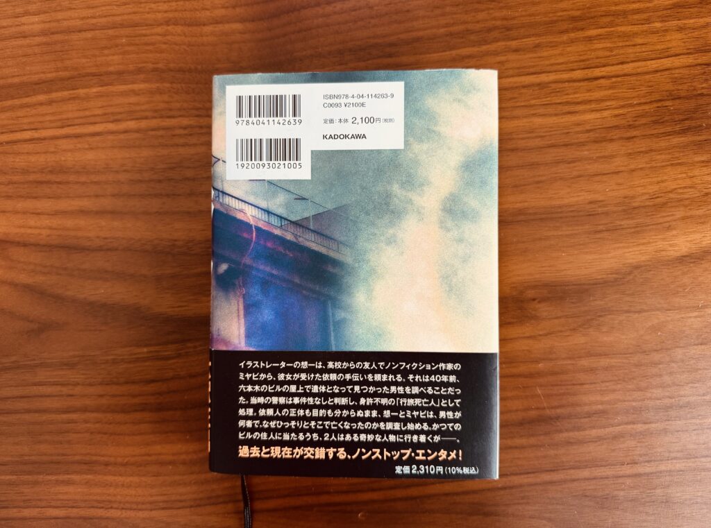 イラストレーターの想一は、高校からの友人でノンフィクション作家のミヤビから、彼女が受けた依頼の手伝いを頼まれる。それは40年前、六本木のビルの屋上で遺体となって見つかった男性を調べることだった。当時の警察は事件性なしと判断し、身元不明の「行旅死亡人」として処理。依頼人の正体も目的も分からぬまま、想一とミヤビは、男性が何者で、なぜひっそりとそこで亡くなったのかを調査し始める。かつてのビルの住人に当たるうち、2人はある奇妙な任物に行き着くがーーーーー。